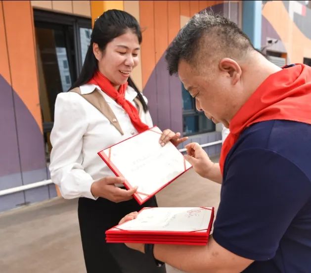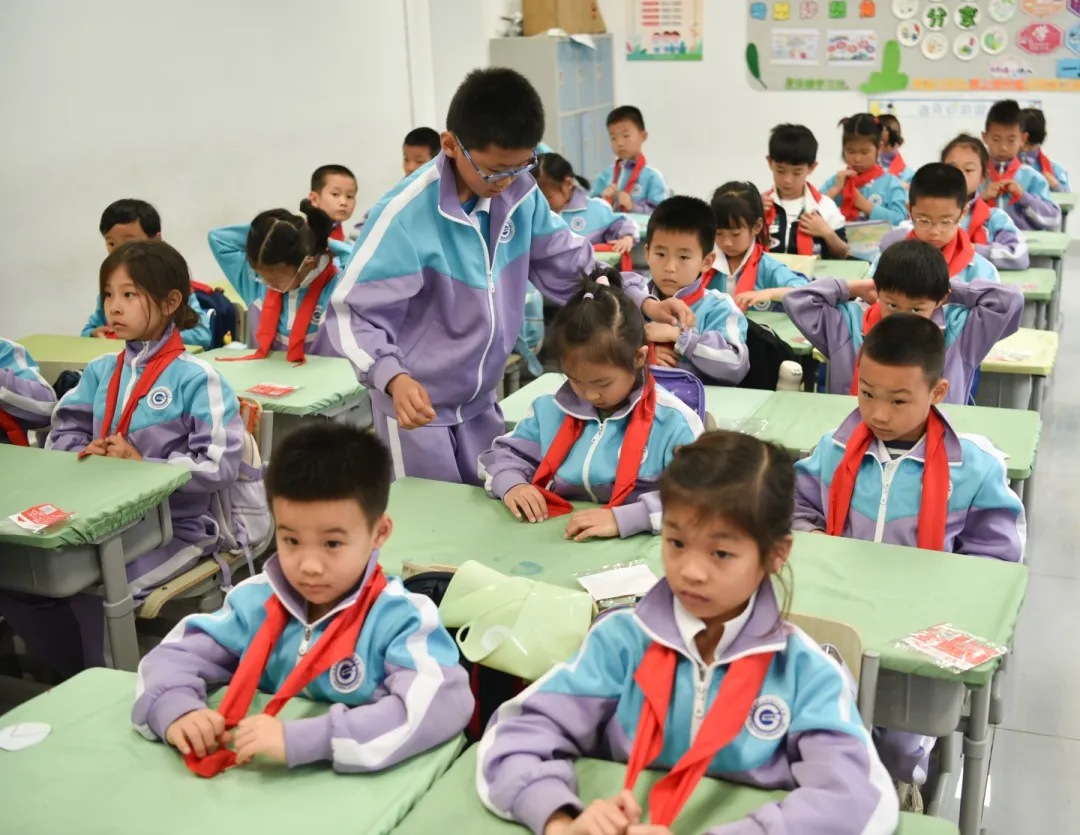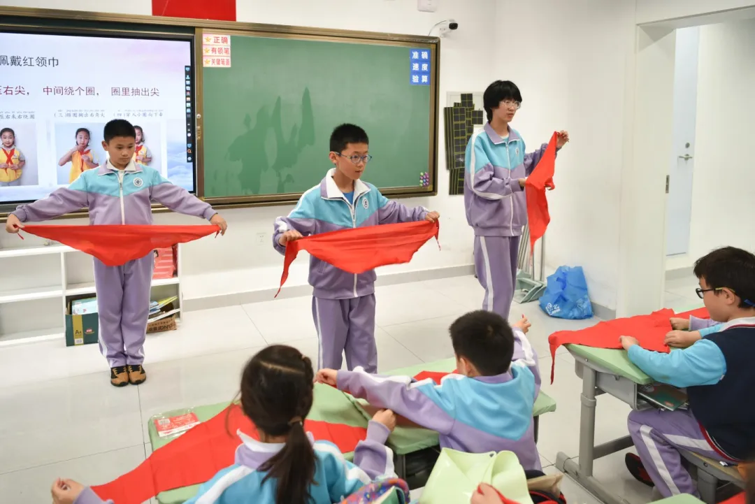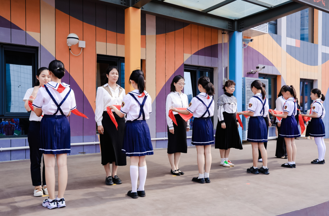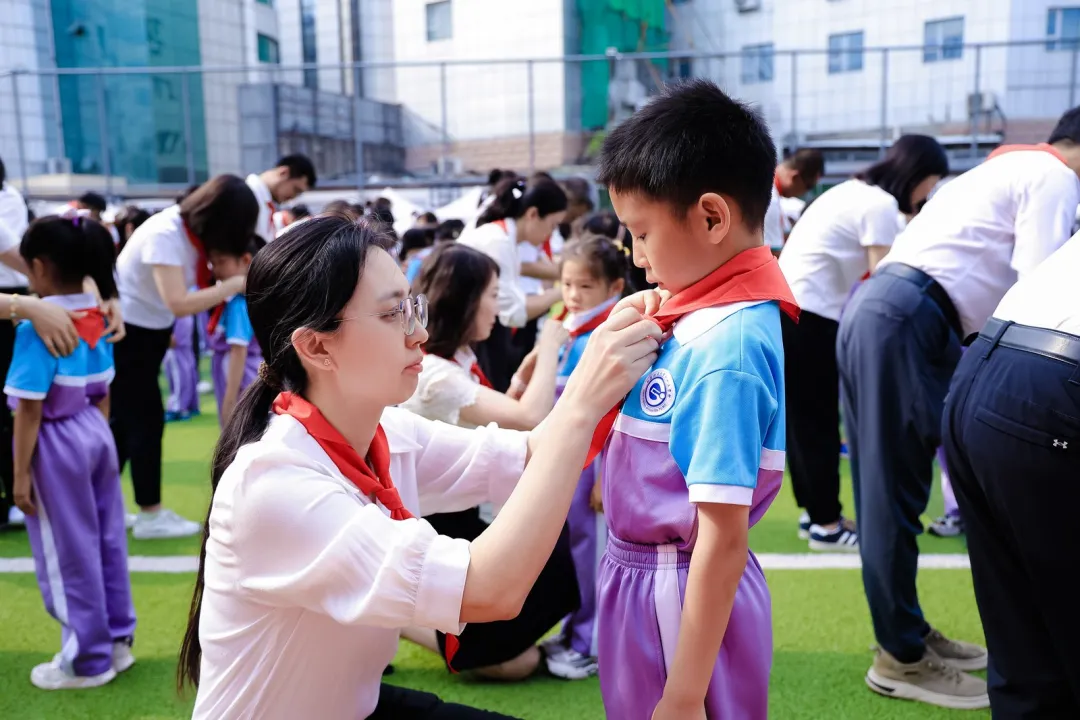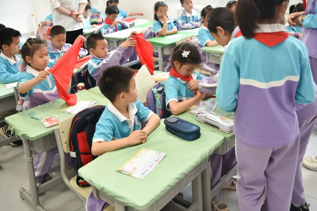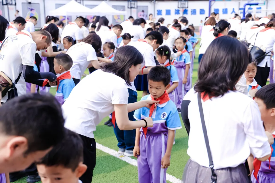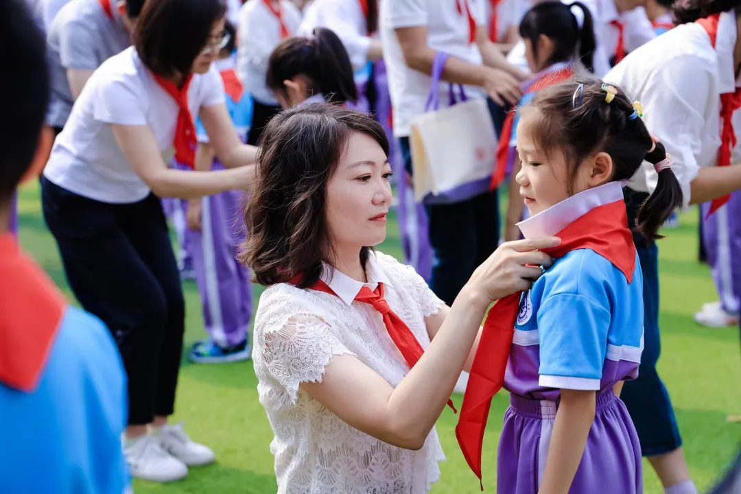 红色信仰,薪火相传,家长志愿者们戴着鲜艳的红领巾,为新队员佩戴上了红领巾。