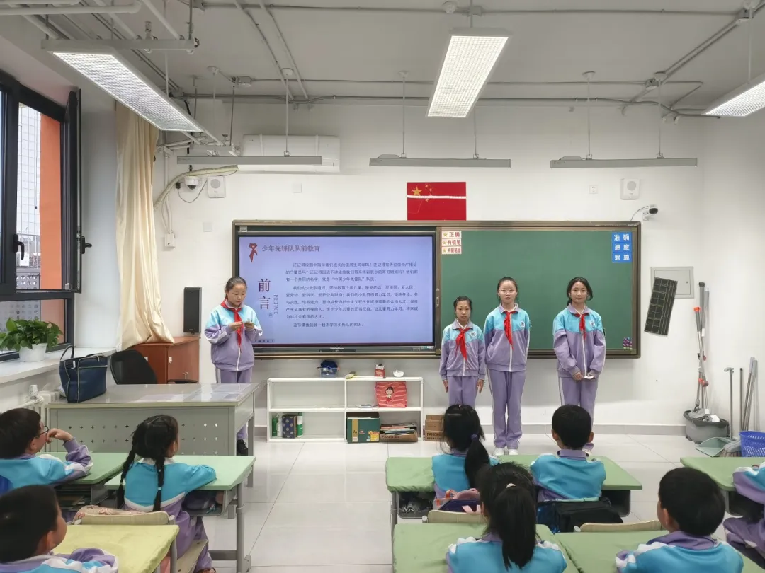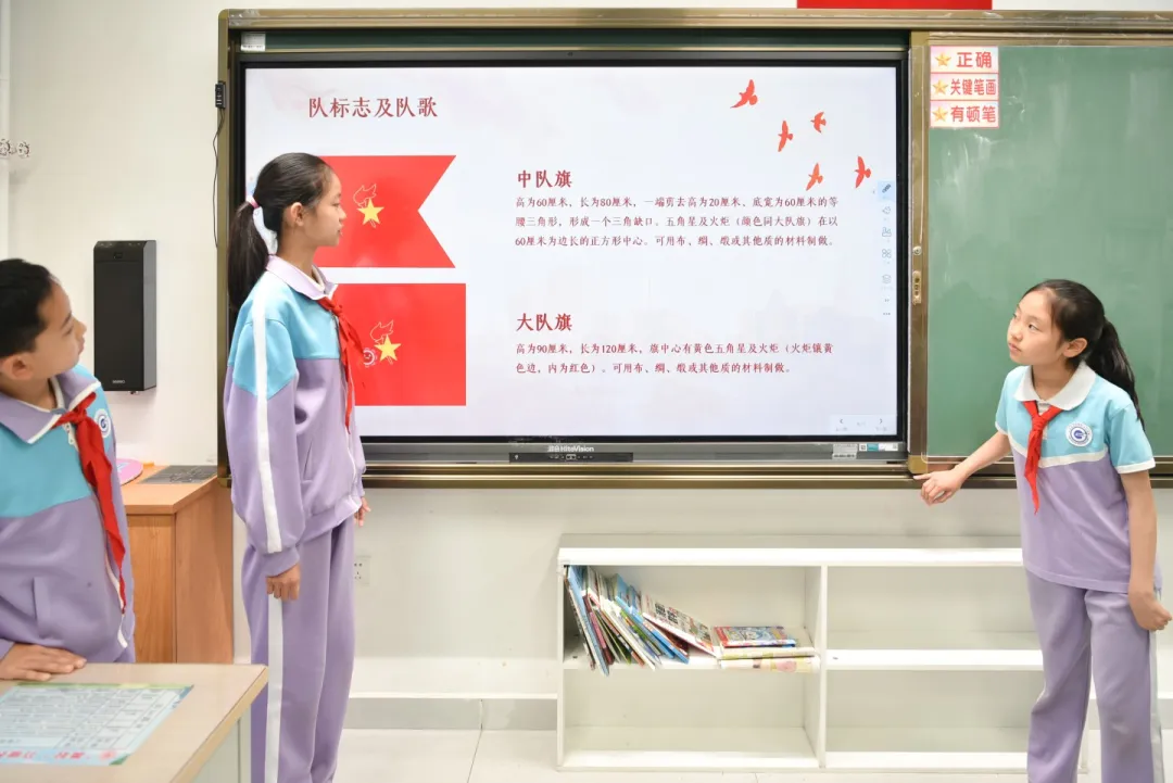 在入队仪式筹备阶段,大队辅导员陈丹妮老师组织大队委,带领一年级进行了队前教育主题班会,深入学习少先队知识,学习佩戴红领巾的方法。还通过入队闯关活动,初步了解了少先队的历史与使命。