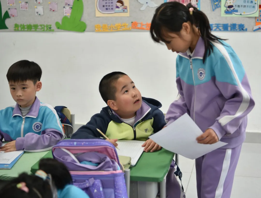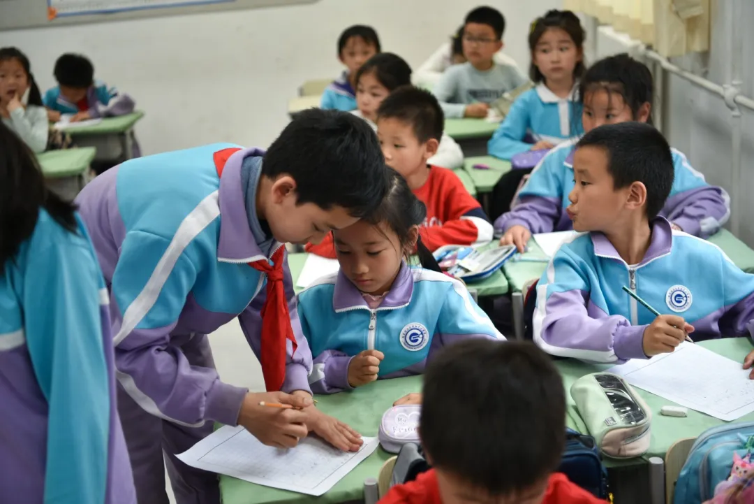 五年级旗手为新建中队授予中队旗,这不仅是旗帜的传递,更是责任的传承。