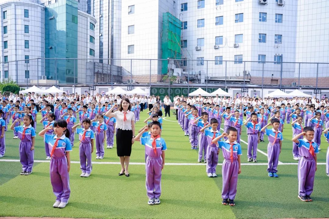 朝气十足的鼓号队用铿锵有力的出旗曲拉开入队仪式的帷幕,旗手们迈着整齐的步伐,手执大队旗前进,二至六年级行队礼,一年级学生目光紧紧追随队旗。全体师生齐唱《中国少年先锋队队歌》,唱出对少先队组织的热爱与自豪。