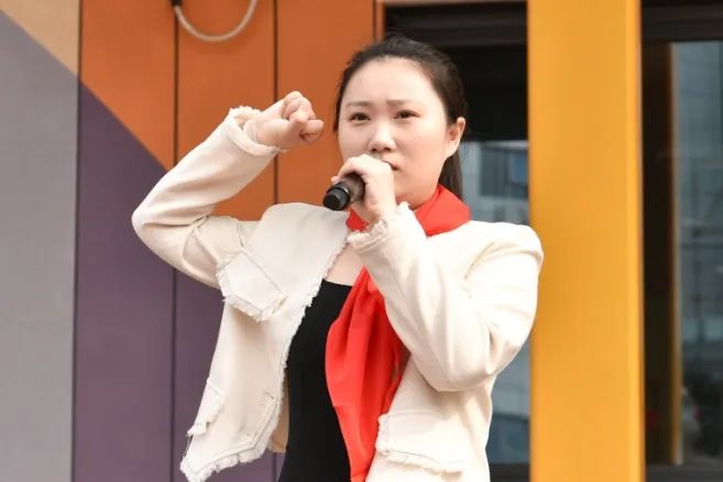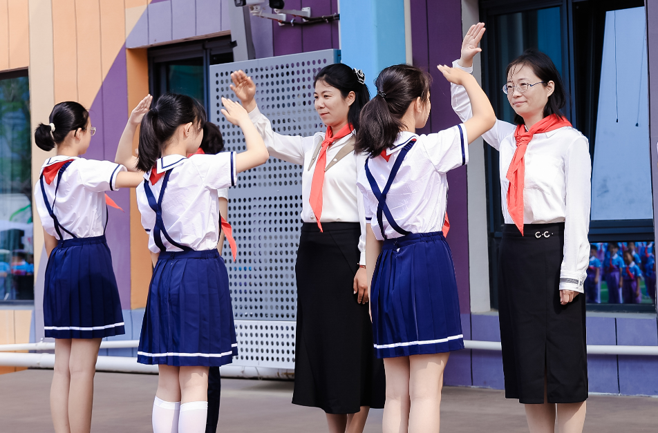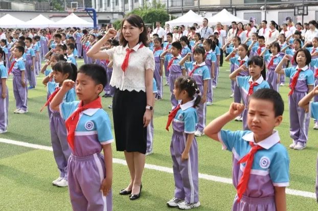 大队辅导员陈丹妮老师带领新队员进行呼号,“准备着:为共产主义事业而奋斗!”“时刻准备着!”响亮的呼号声展现出新少先队员们昂扬的精神面貌。